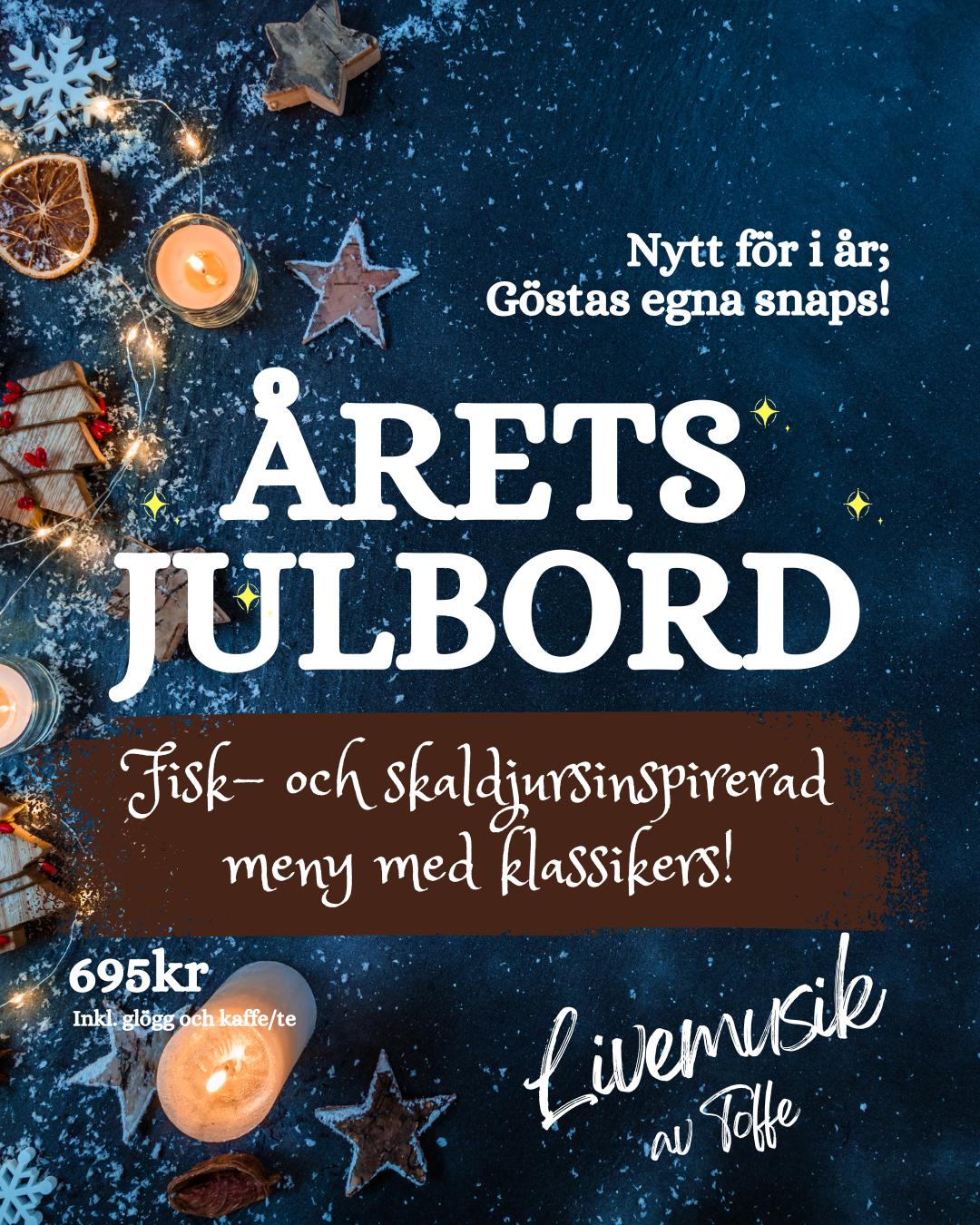 När vintermörkret sänker sig över Smögen tänder vi ljusen och dukar upp ett fisk- och skaldjursinspirerat julbord fyllt av havets läckerheter och klassiska julsmaker. I år har vi dessutom tagit fram vår egen snaps, skapad särskilt för julbordet. Toffe står för livemusiken och ser till att stämningen blir precis så där varm och trivsam som man vill ha den i juletid.